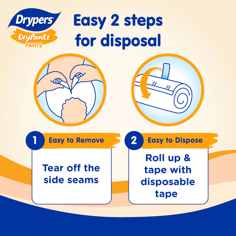 Easy Disposal Tape memudahkan proses pembuangan lampin terpakai. Selepas menukar lampin, anda hanya perlu menggulung lampin dan melekatkan pita pelekat untuk memastikan ia tertutup rapat. Ini membantu mengekalkan kebersihan dan mencegah penyebaran bau yang tidak menyenangkan.